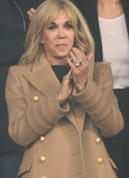 2023年4月29日布丽吉特在巴黎法兰西体育场举行的法国杯足球赛“南特 vs 图卢兹”中穿上米色外套;