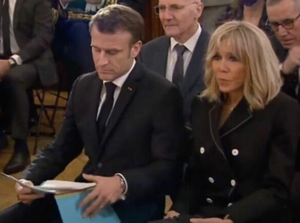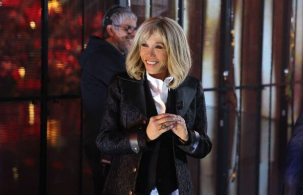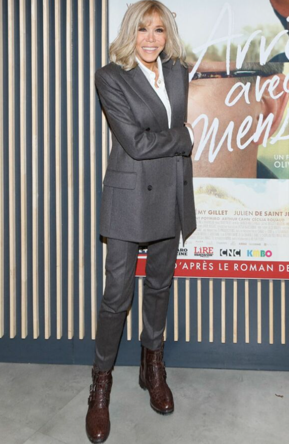 2023 年 2 月 21 日,布丽吉特出席巴黎 UGC 丹东电影院举行的电影《停止你的谎言》首映式。在这个场合,第一夫人选择了合身的灰色西装和棕色踝靴