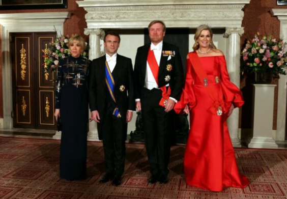 2023 年 4 月 12 日,布丽吉特在对荷兰进行国事访问期间身着宝蓝色西装,光彩夺目;