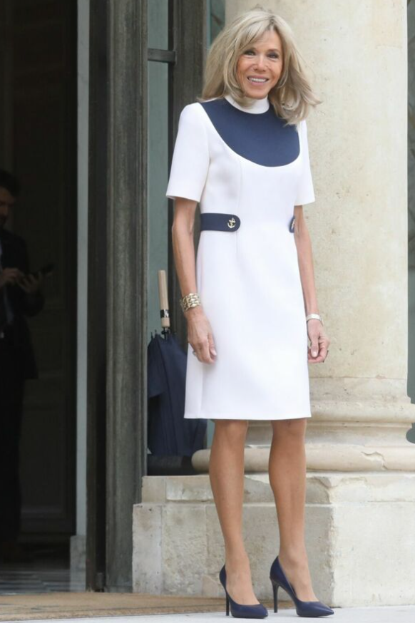 2023 年 7 月 25 日,布丽吉特身着双色连衣裙在巴黎爱丽舍宫接见美国第一夫人吉尔·拜登(Jill Biden);