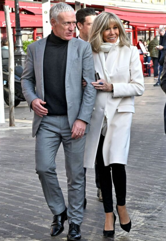 2023 年 1 月 11 日,布丽吉特在尼斯与迪迪埃·德尚 (Didier Deschamps) 一起穿着上象牙色外套;