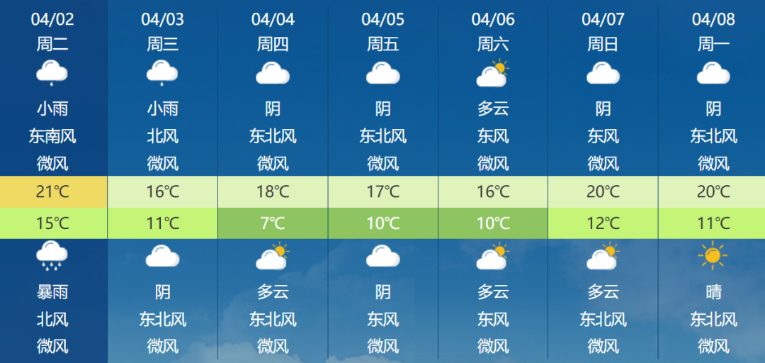 今天最高气温:20℃到21℃明晨最低气温:12℃到13℃3日阵雨渐止转阴到多云3日最高气温:15℃到16℃4日最低气温:8℃到9℃4日多云4日最高气温:17℃到18℃5日最低气温:6℃到7℃