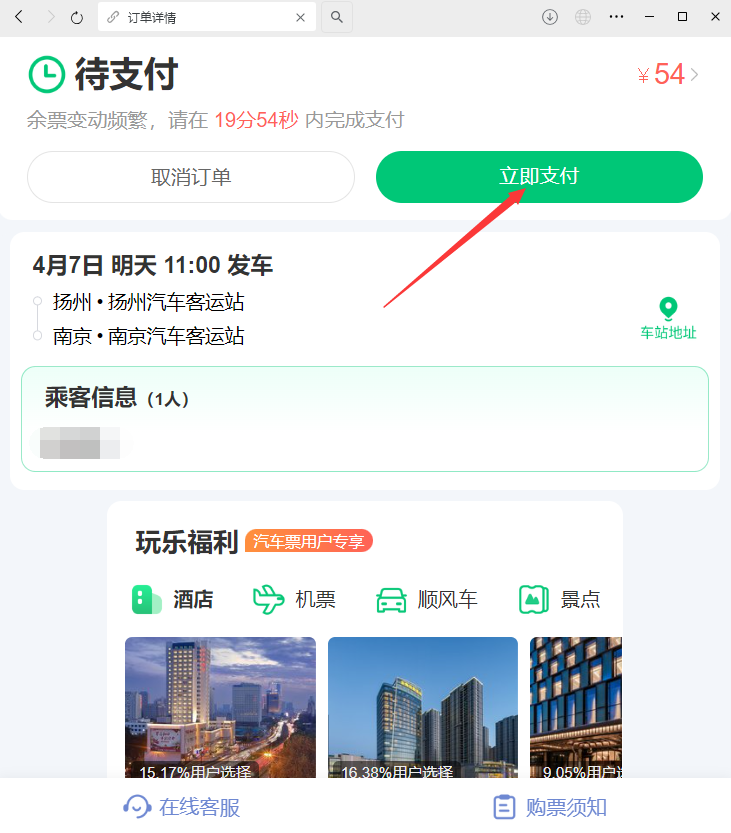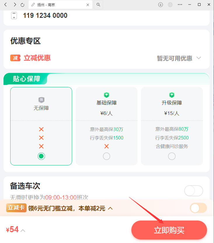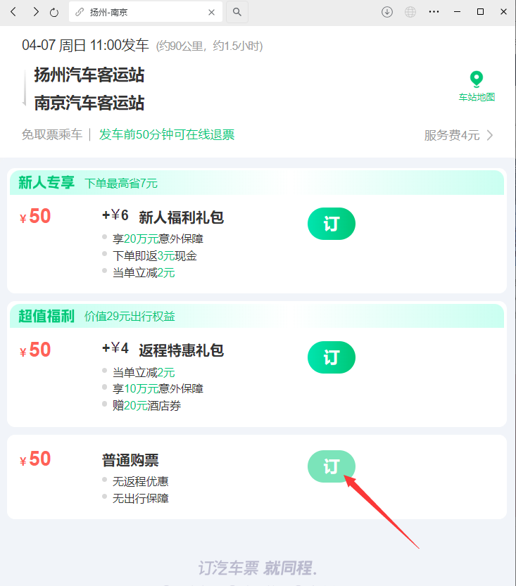 4、选择好具体的车次后,会进入购票页面,需要注意的是,页面提供了几个不同的套餐,你可根据自己的需求自由选择,点击【订】↓(以下以普通购票为例)
