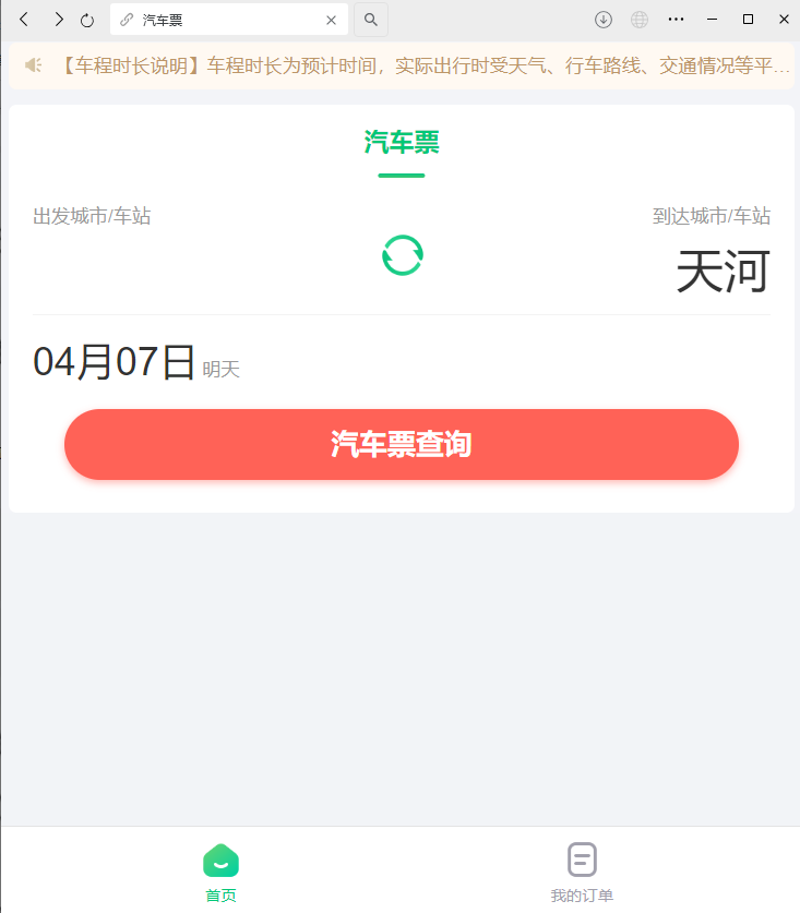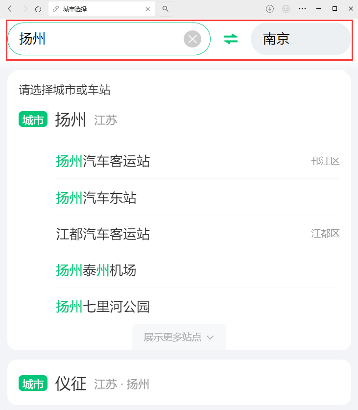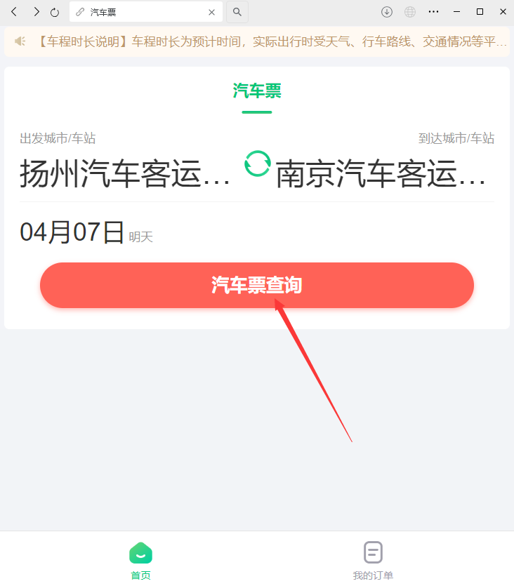 2、选择出发地和目的地城市/车站,然后点击【汽车票查询】↓