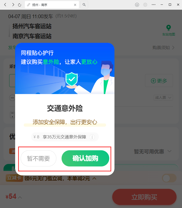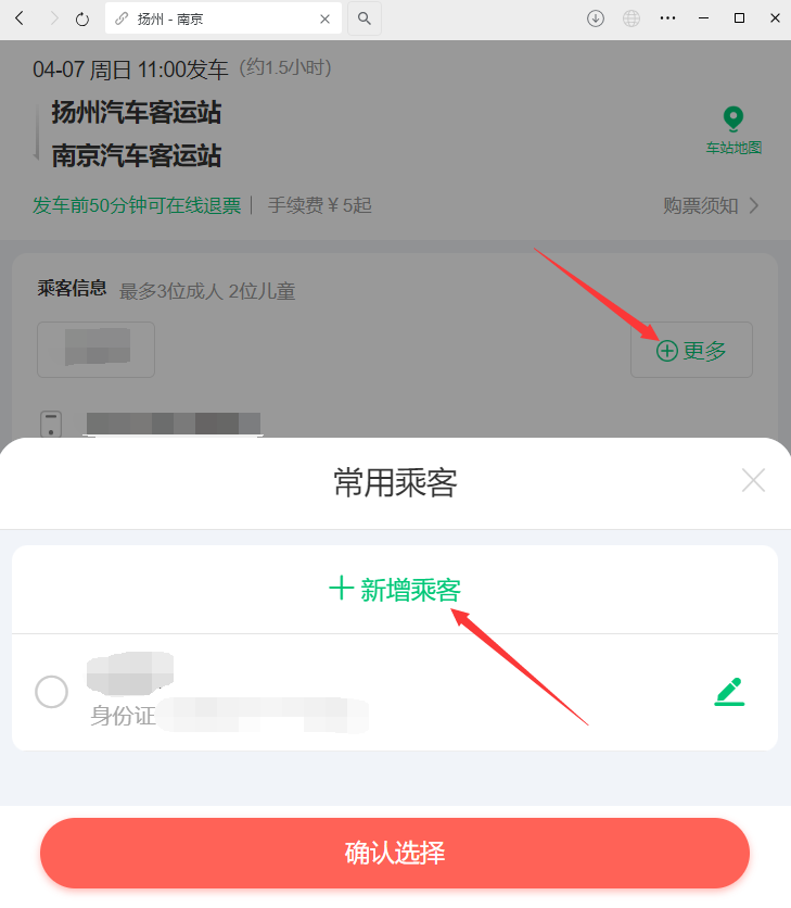 5、第一次购票需要添加乘客信息,点击【添加乘客】,输入乘客姓名、身份证号,点击【确定】(可添加多位乘客)↓