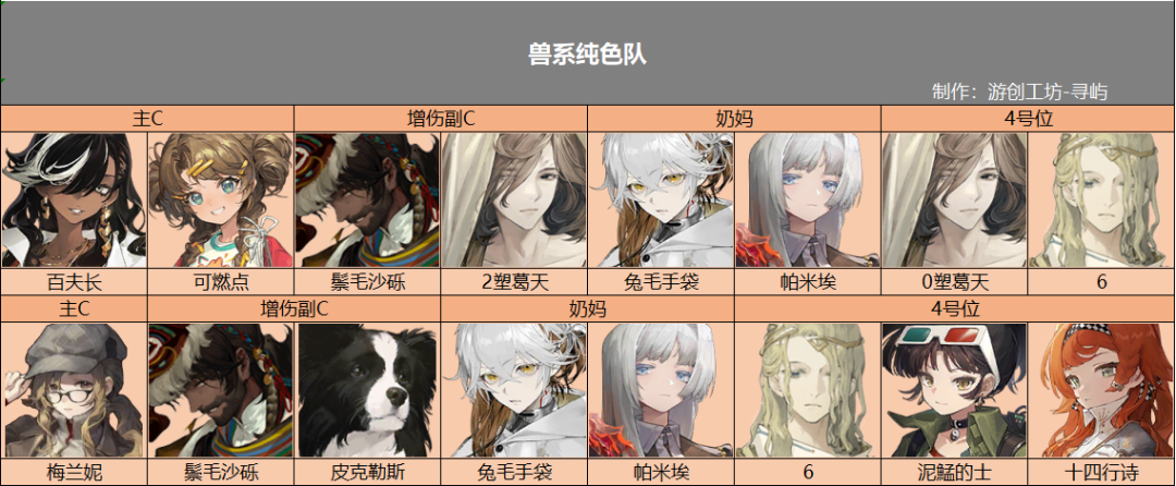 梅兰妮(主C),鬃毛沙砾/皮克勒斯(副C),兔毛手袋/帕米埃(奶妈;换成牙仙更优),6/泥鯭的士/十四行诗(4号位)。(目前梅兰妮并不适合走纯兽)