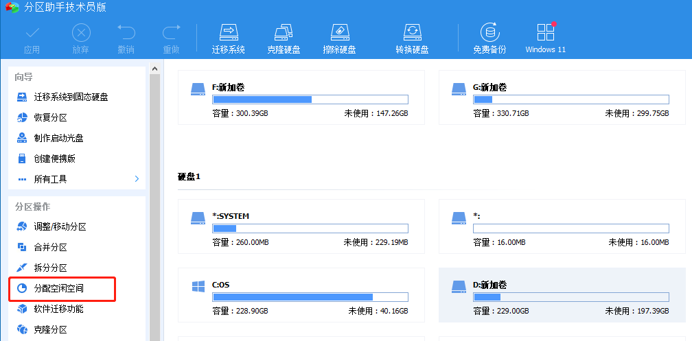 具体操作,就是找到空间比较大的硬盘,点击左侧边栏中的“分配空闲空间”: