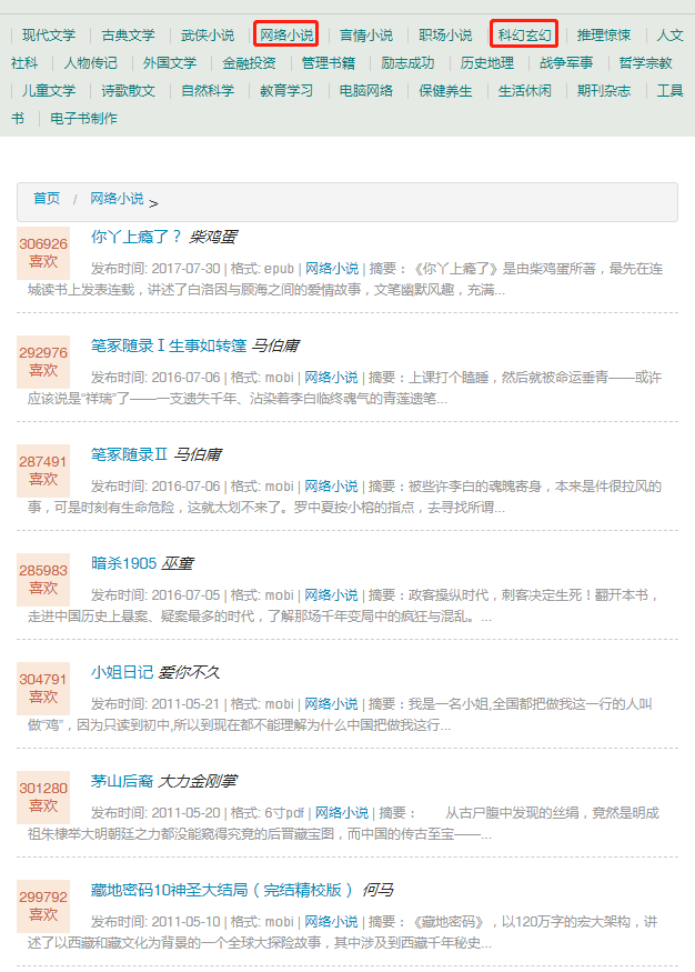 除了这些相对严肃的书籍外,网站也收录了大量的“网络小说”、“科幻玄幻”等内容,对于喜欢看小说的朋友们来说,这便是最好的福利了吧: