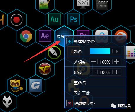 鼠标右击收纳格,便可新建分类,除此之外,也支持修改图标的颜色、透明度、尺寸、命名、固定位置等,如果对单个文件或者整个分类不满意,也可以释放和解散。