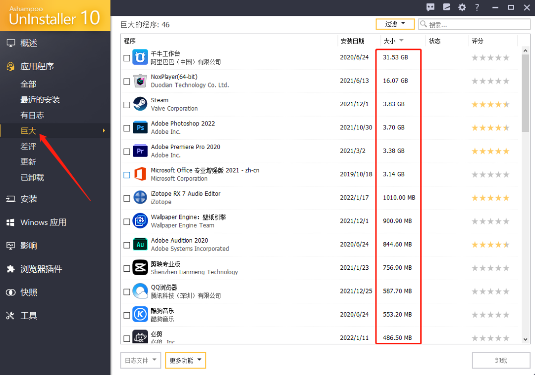 肯定有小伙伴会问,它与其它同类软件相比,有什么特点吗?这是肯定的,重点便在于它具有强大的筛分能力!如图所示,它能够识别出各种筛选条件下的软件,比如超大容量的,这对于游戏党来说,意味着什么,已经不言而喻!