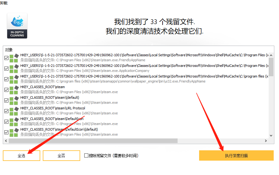 在以上操作后,软件会提醒你,识别出多少残留文件,这个时候我们“全选”,并点击“执行深度扫描”: