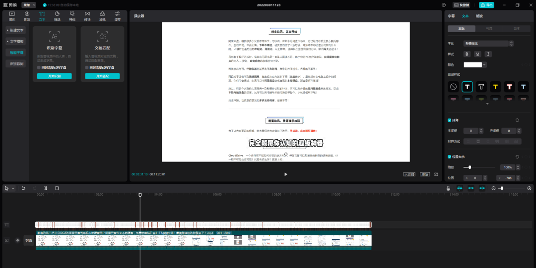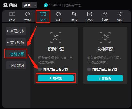 然后,找到顶部的“文本”-“智能字幕”-“开始识别”,之后全程躺着就行了: