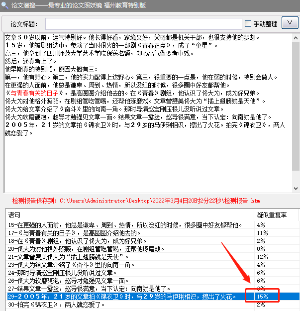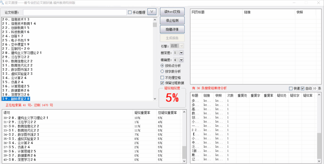 然后,就是见证奇迹的时候!软件会自动将你的内容与网上相似的文章进行比对,并在右方的窗口里,列出具体的链接: