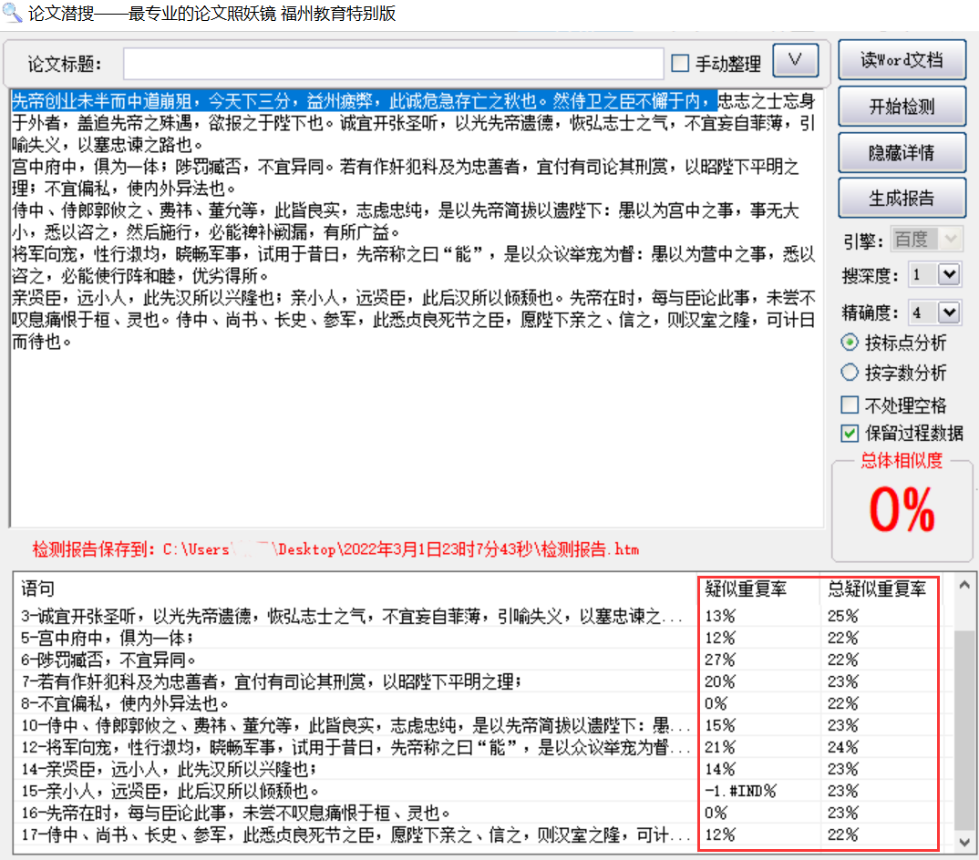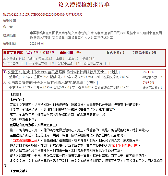 但是你们看,刺客从网上找的文章,它就能查出来,相似度越高,自然越危险,所以说这个工具还是非常靠谱的: