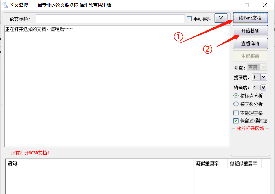 首先,领取刺客今天提供的资源,解压后打开,先点击右上角的“读word文档”,然后勾选你写好的内容,当然,我们也可以完全用手动复制粘贴的方式来进行,全部搞定了之后,点击“开始检测”: