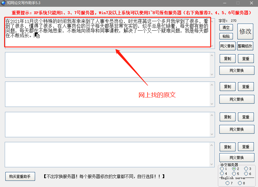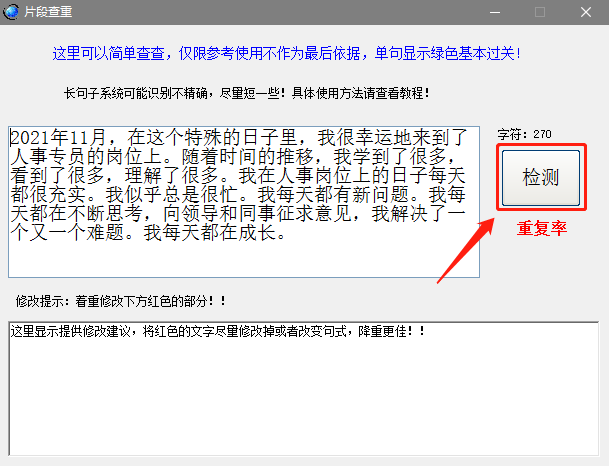 我们可以检验一下它的重复率,比如第二段的,看看“查重”:
