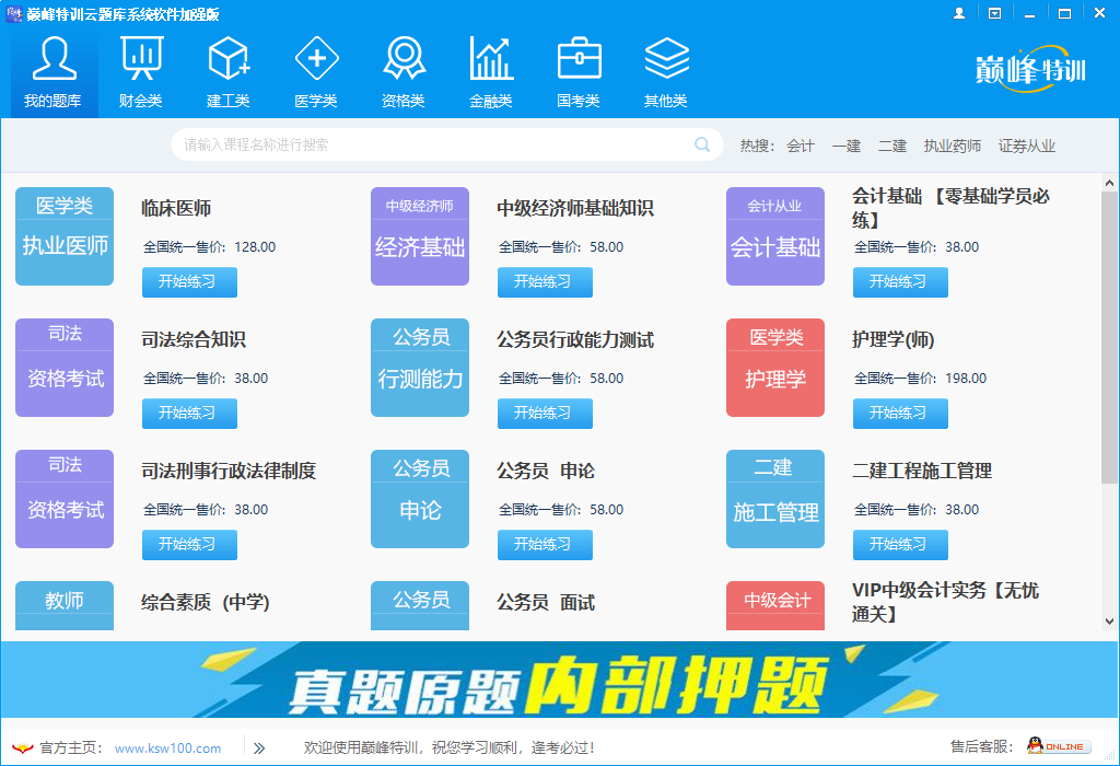 巅峰特训云题库,这是一个可以说是为各种考试量身定制的软件,包含的种类也是非常广泛,包括有:财会、建工、医学、资格、国考、其他等等.....,反正你们想考的行业这里全都有,就是这么强大!