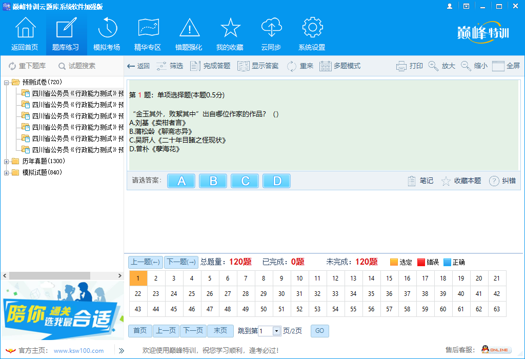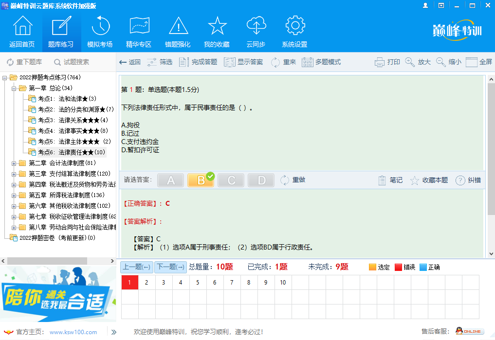 软件同时提供了练习和模拟考两种模式,前者,答完一题即显示当前正确与否,而后者,则是答完全部100道题后,显示考试成绩,大家可以搭配来使用: