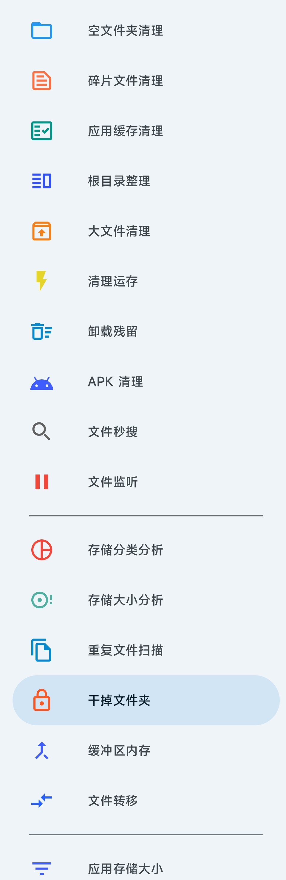 除此之外,软件还提供了文件秒搜、文件监听、存储分类分析、存储大小分析、重复文件扫描、文件转移等各式各样的功能,它又相当于一款非常好用的手机资源管理器了: