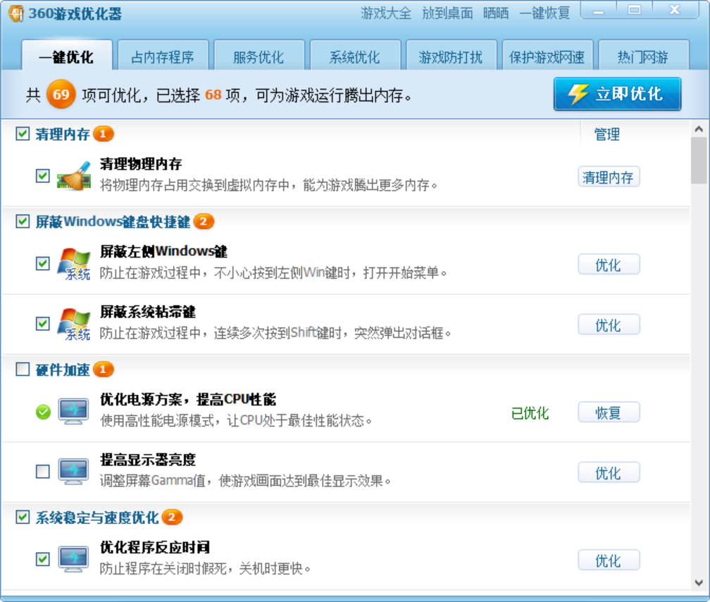 甚至游戏玩家最心心念念的:游戏优化器,也同样为大家安排上了: