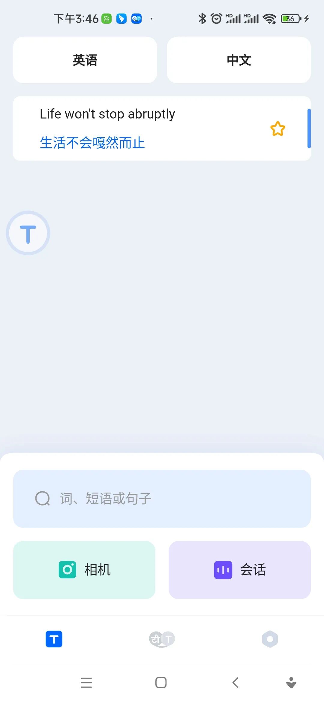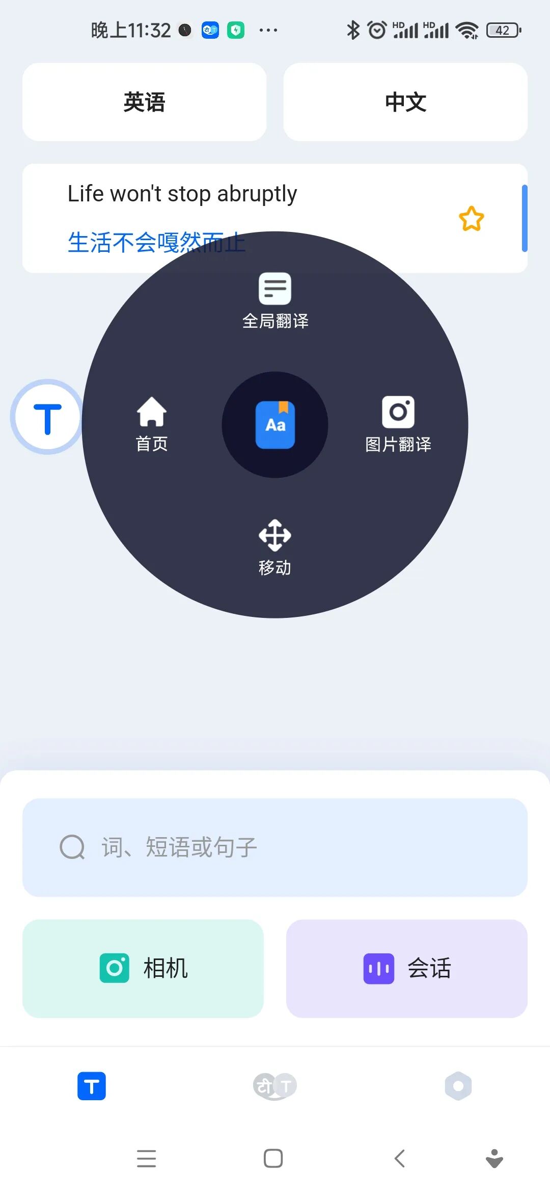 使用起来也很方便,点一下悬浮球,会开启相应的功能项,包括:全局翻译、图片翻译,点击中间的Aa,就是文本翻译。