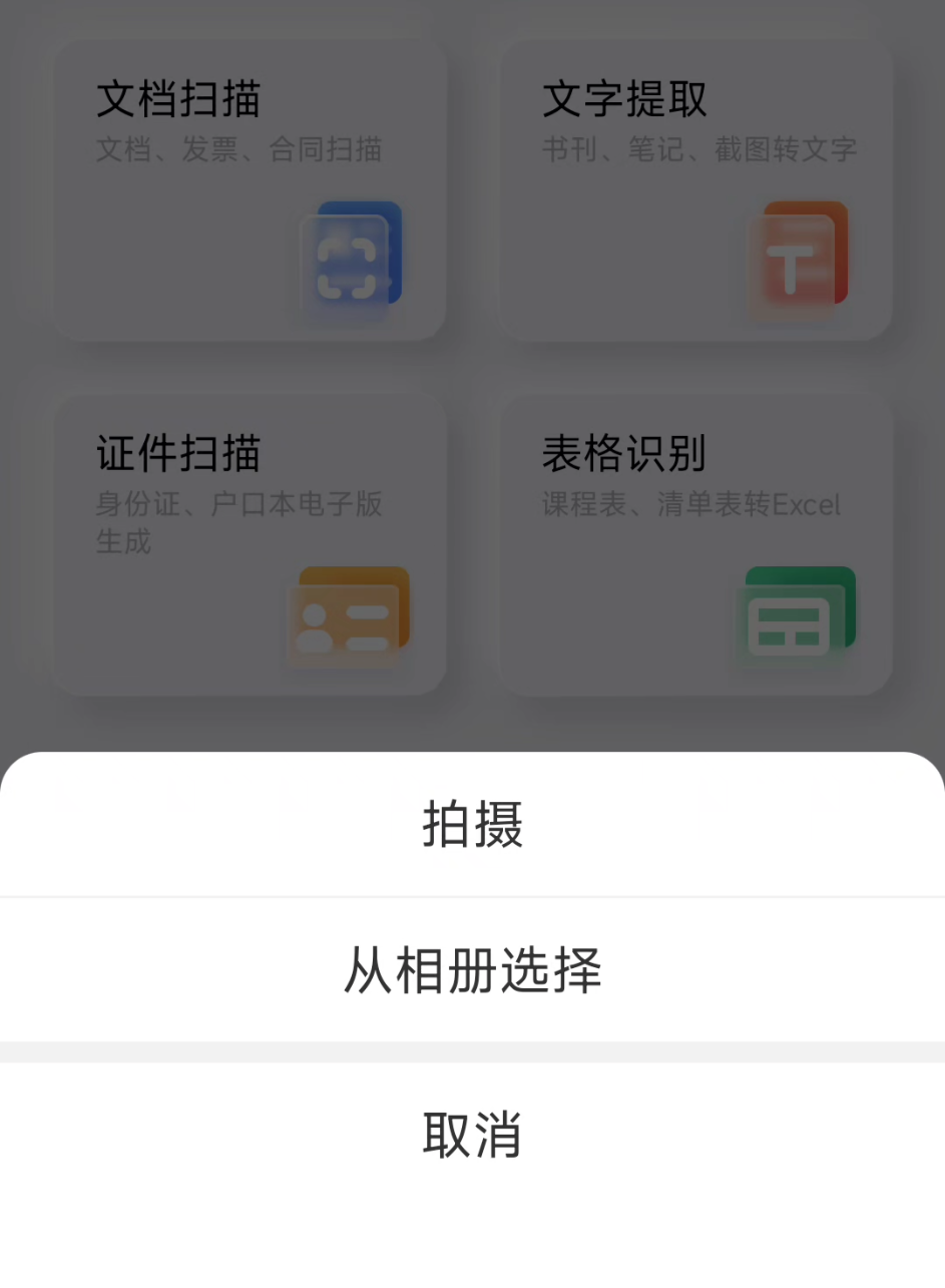 我们一样样来看,首先是文档扫描,相信所有职场打工族们,都会遇到此类需求,它也提供了拍摄、相册选择两种提交方式: