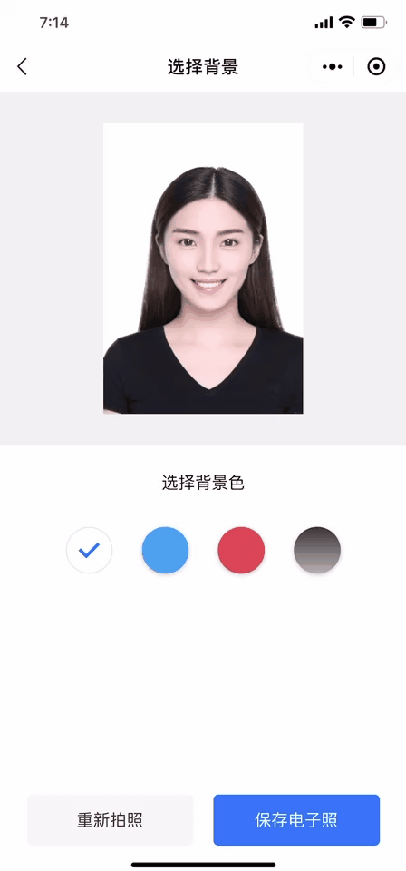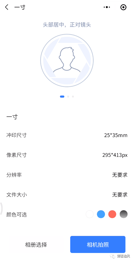 选定尺寸规格后,就可进入下一步提交照片,软件支持拍照和从相册中选择照片进行处理,这都比较常规了: