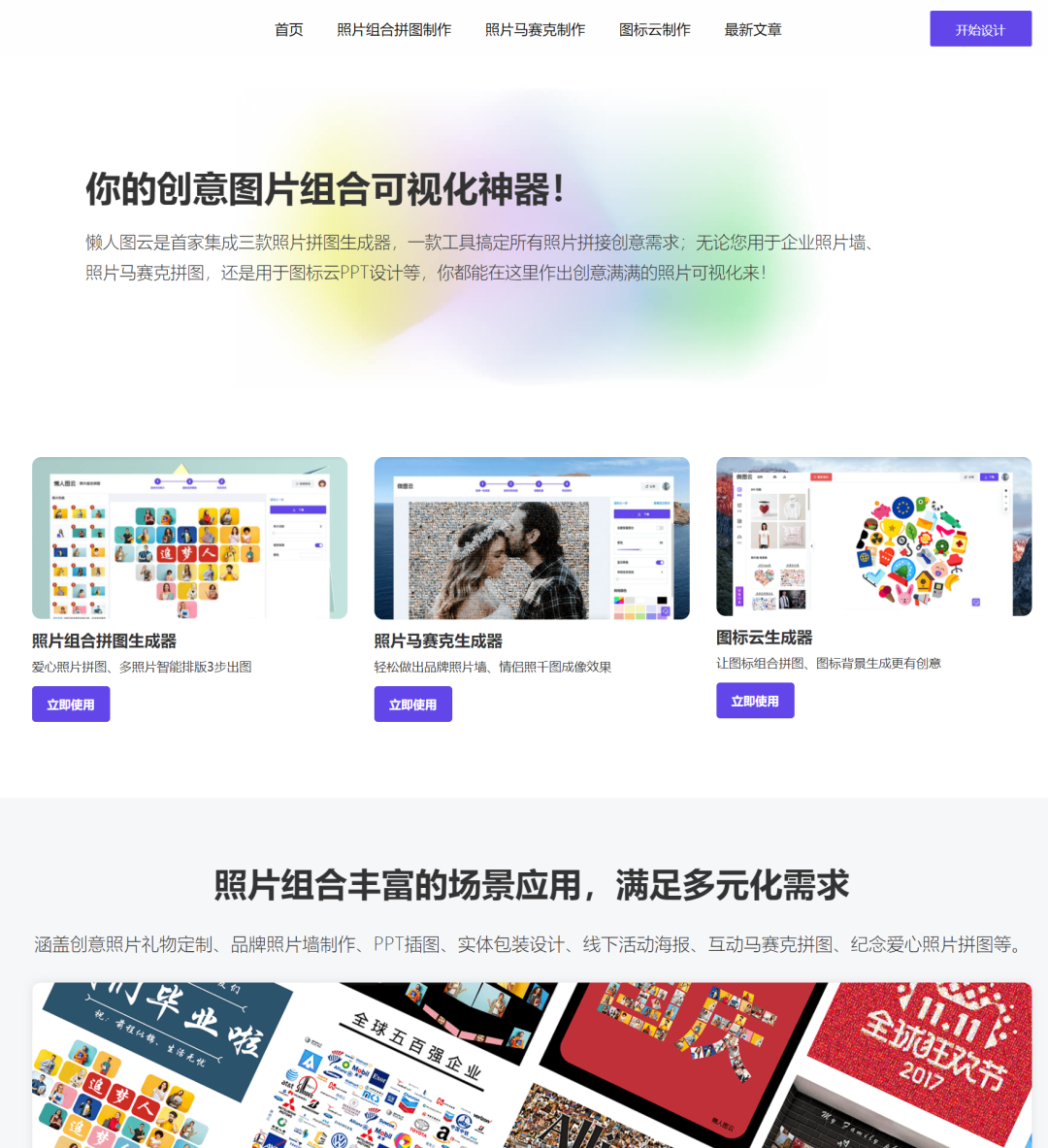懒人图云,这是一个史上最强的在线排版黑科技网站,用网站自己的话来说,那就是:“你的创意图片组合可视化神器”,说的比较文雅,翻译过来就是,可以搞定所有照片拼接需求的在线工具,包括:照片墙、照片马赛克拼图,图标云等等,令人叹为观止。