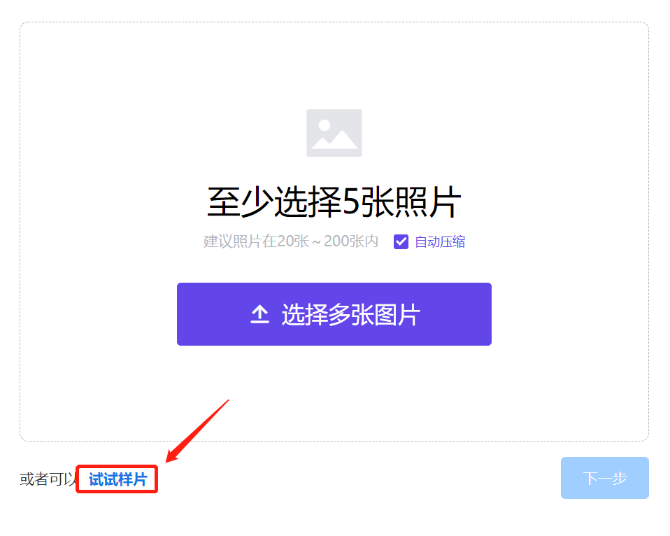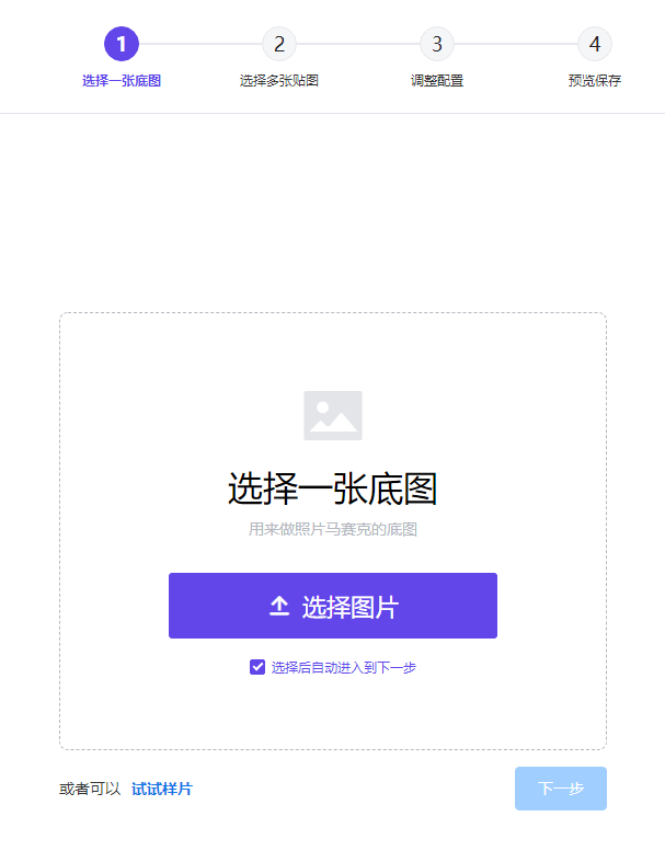 我们直接点击上方的“照片组合拼图生成器”,进去后基本就是添加照片,如果手上没什么图,也可以使用下方的“试试样片”:
