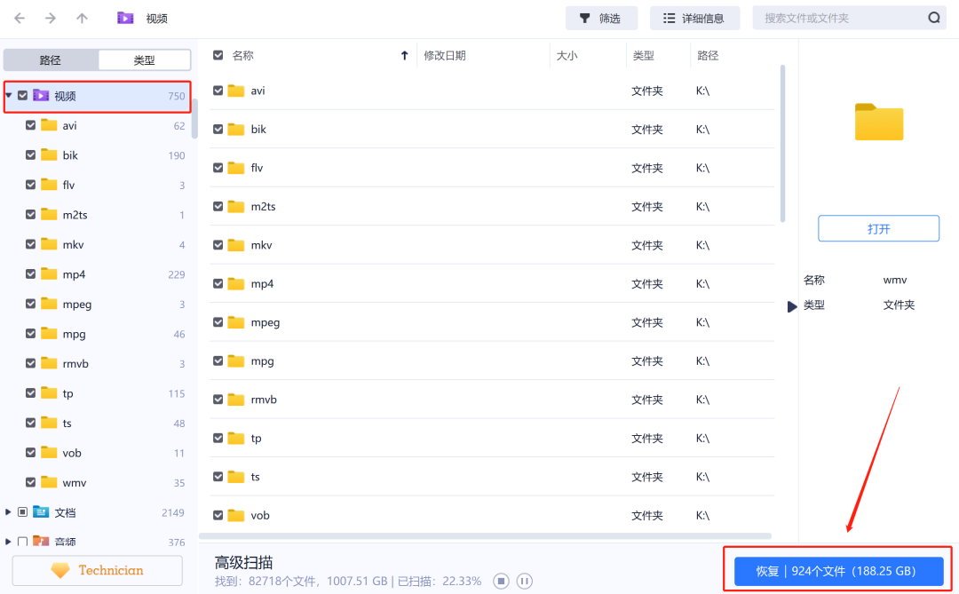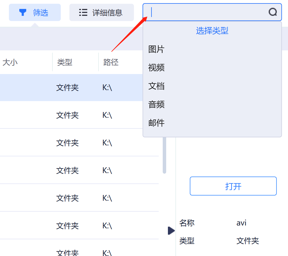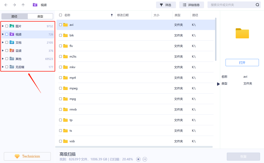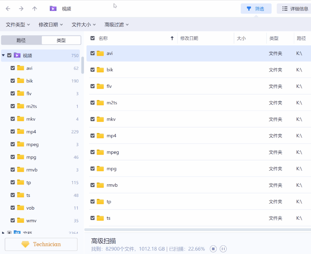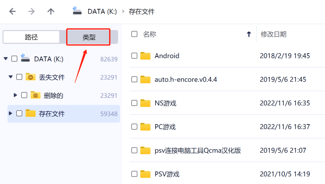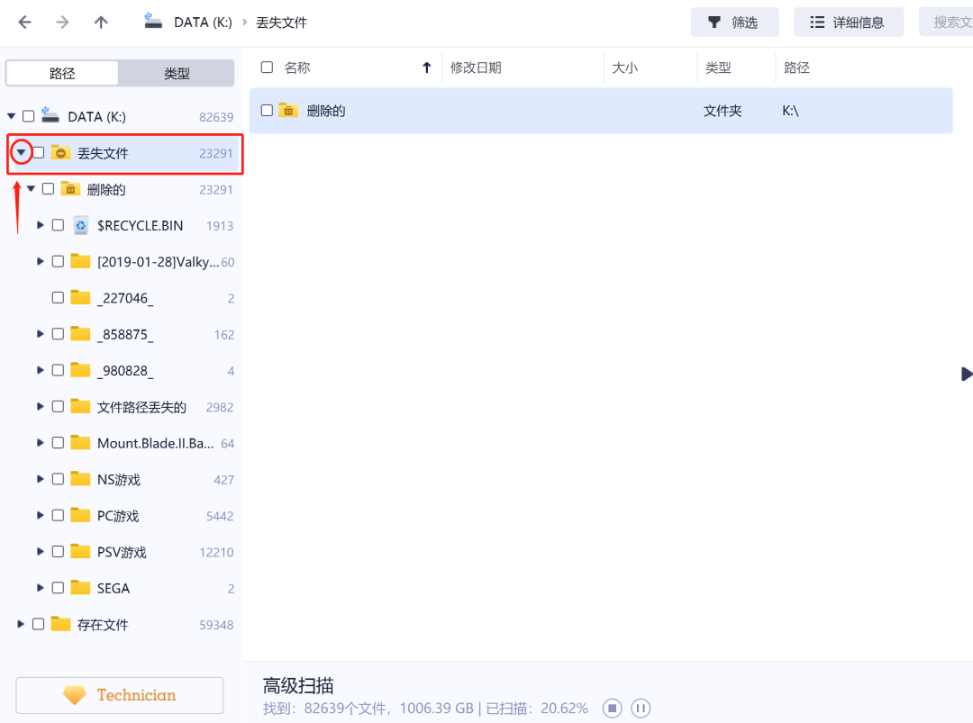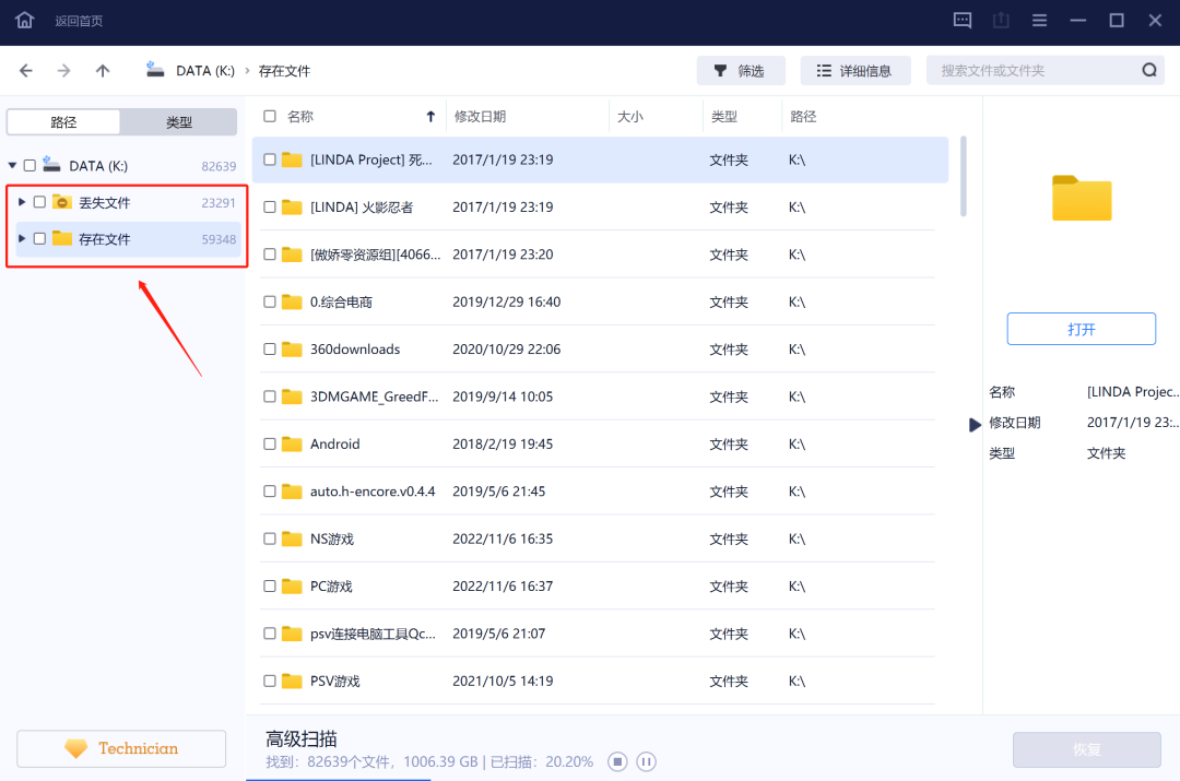 我们随便扫描一个盘瞧瞧,比如这个K盘,它会将结果细分为:丢失与存在。