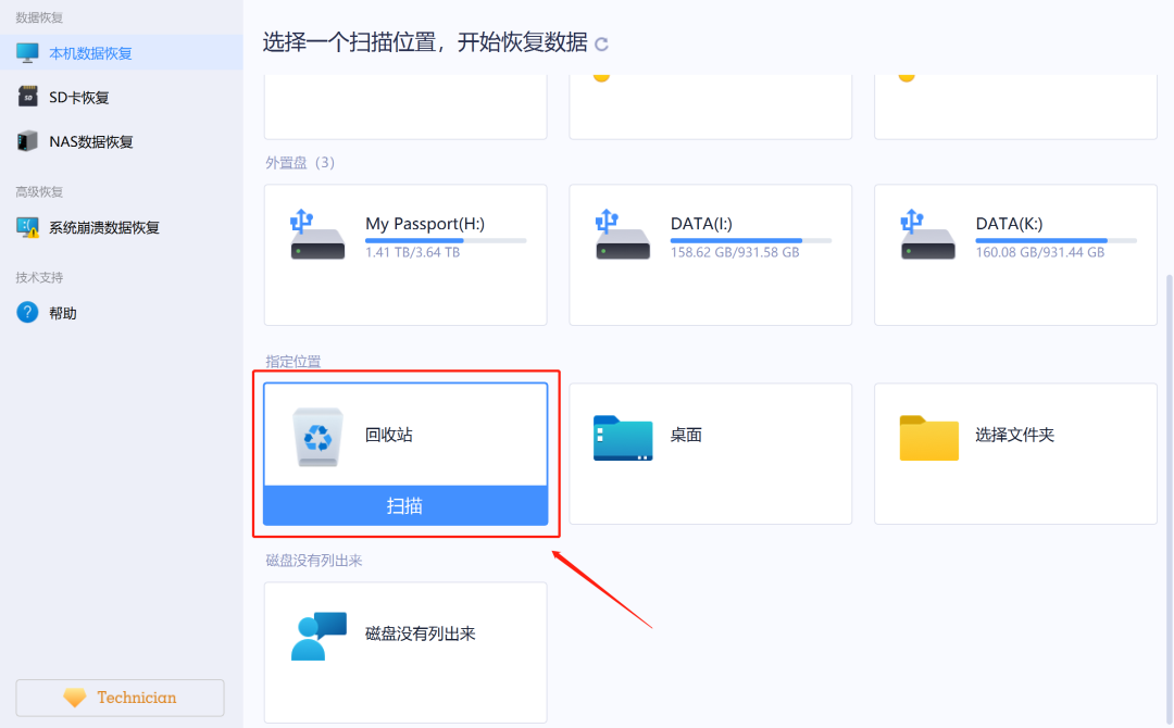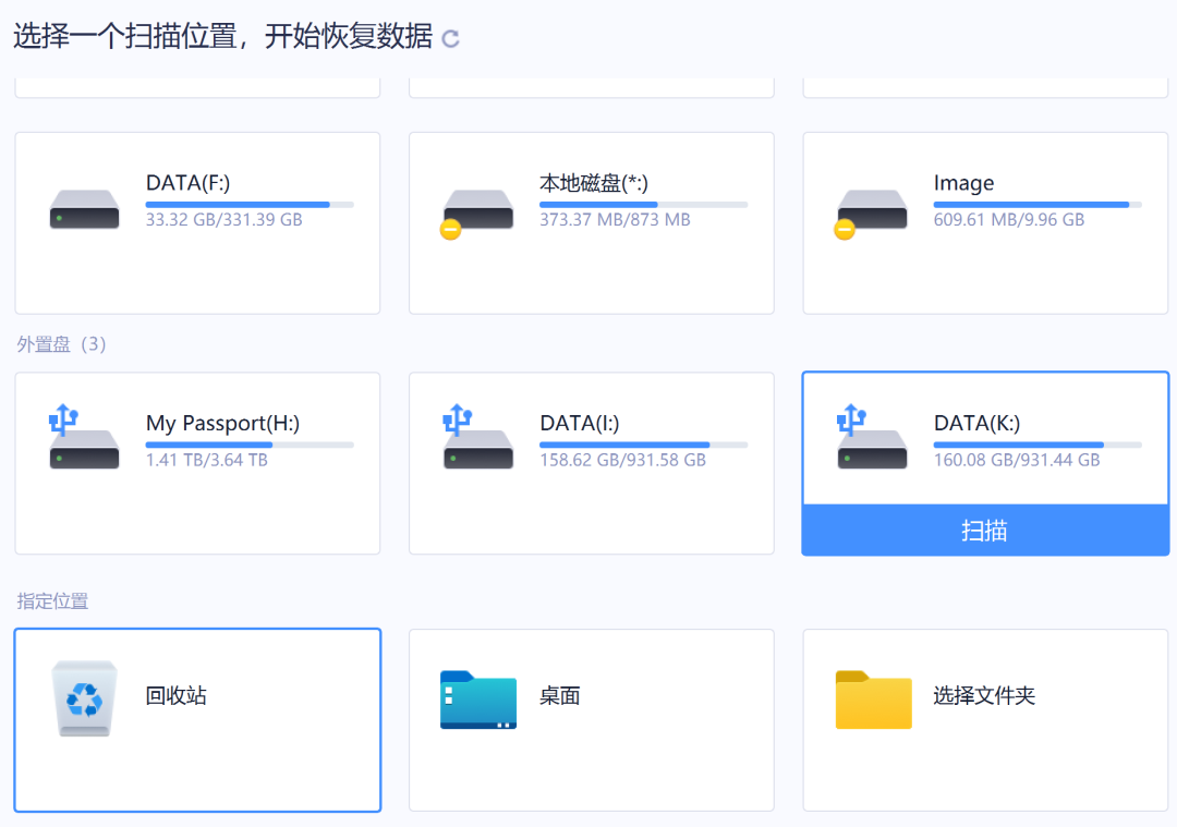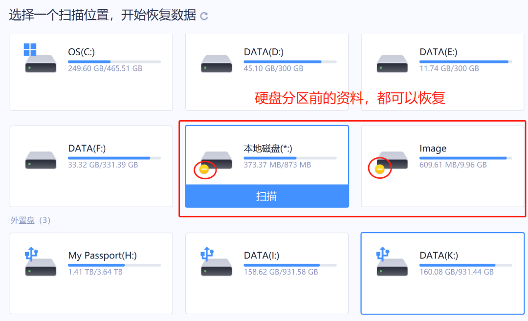 使用也很简单,将鼠标停在相应盘符,再点击底部浮现出的“扫描”按钮,就搞定了。