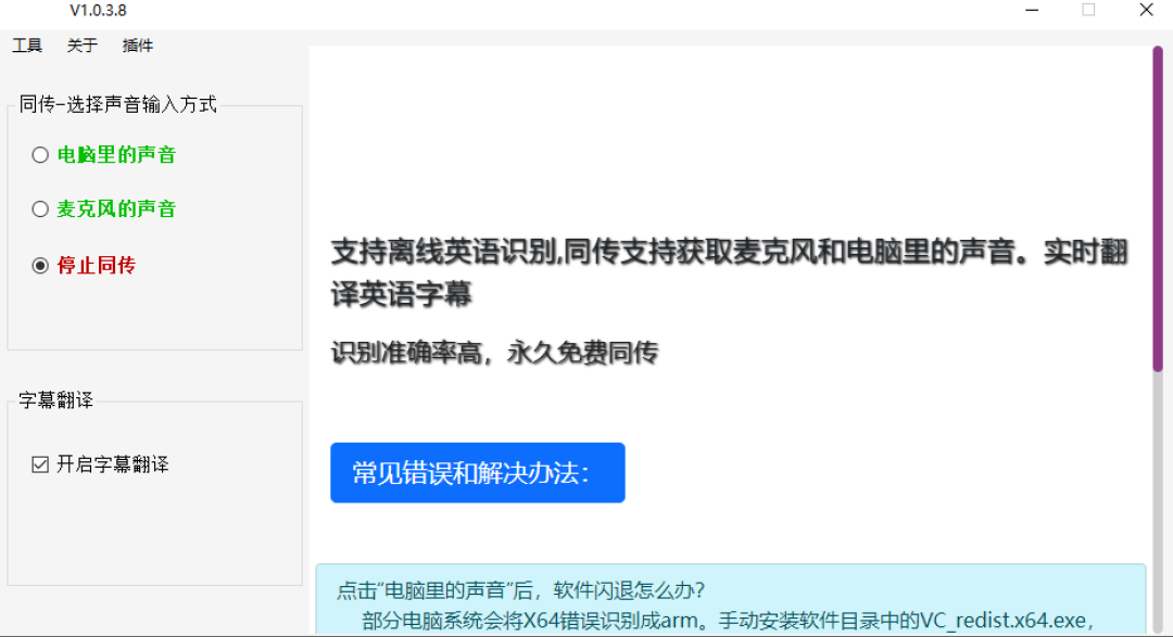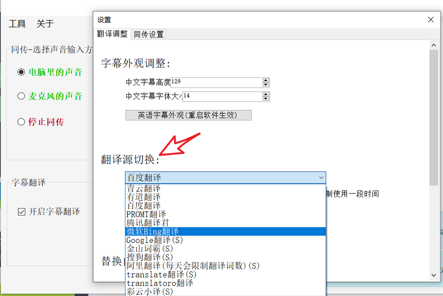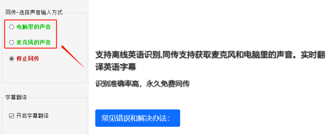 这里有两种声音识别方式,分别是电脑里的声音和麦克风的声音,刺客的理解是前者为输出翻译(听),后者为输入翻译(说),是不是比较形象?