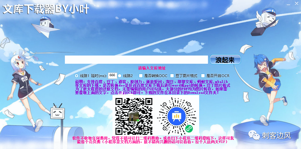 使用方法和冰点差不多,将网页上的文库地址链接,粘贴到输入框内,再点击“浪起来”按钮,基本就完事了: