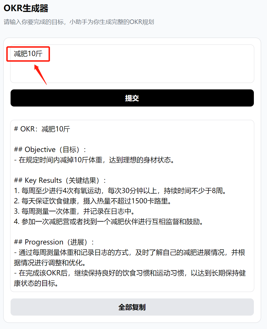 然后,OKR生成器可以理解为方案策划,能够将具体目标进行分解,刺客看了下,感觉也是非常靠谱。