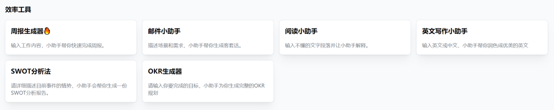 效率工具里面,包括了:周报生成器、邮件小助手、阅读小助手、英文写作小助手、SWOT分析法、OKR生成器。