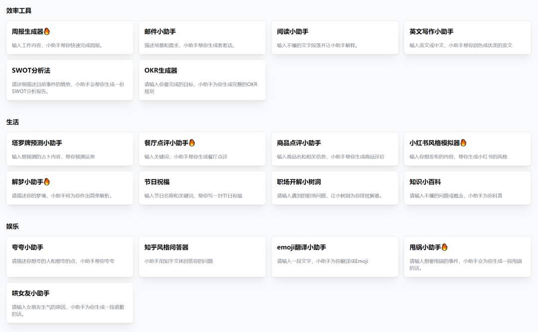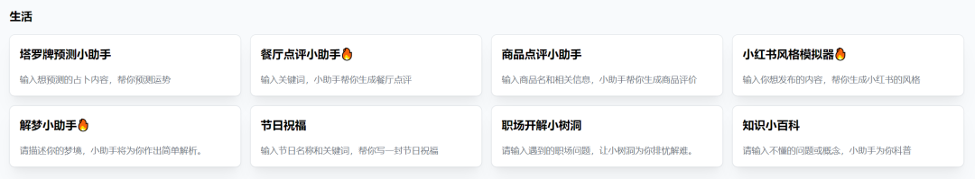 效率工具就这么多,咱们再来看看生活类的,里面内容很多,像什么塔罗牌、餐厅点评、商品点评、小红书风格模拟器等等,可谓应有尽有!