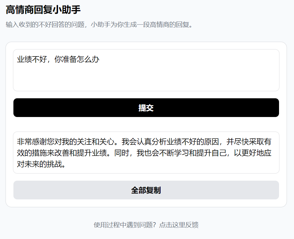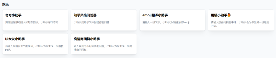 接下来,咱们再来看看娱乐类,这里面有很多有趣的玩意:比如:教你怎么夸人、怎么生成表情符号、怎么甩锅、怎么哄女友、怎么高情商回复别人,真是把人情世故玩到极致!