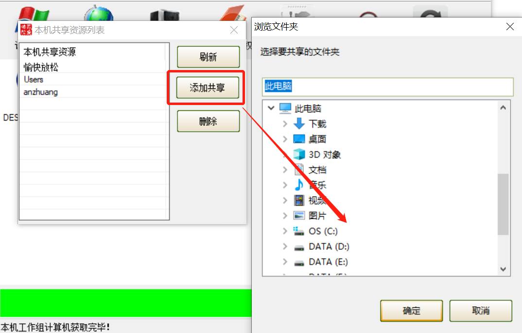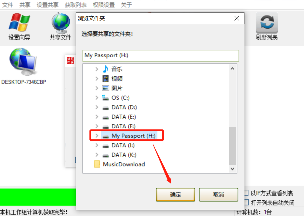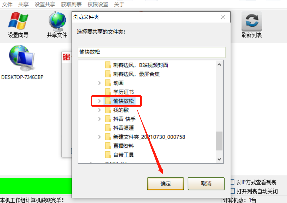 至于分享文件夹,也很简单,点击左侧的小箭头一步步来就行了,最后,点击确定。