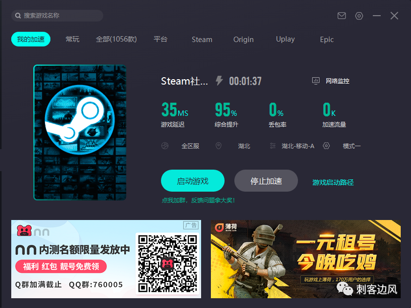 将三个软件都安装好后,先用加速器对Steam进行加速: