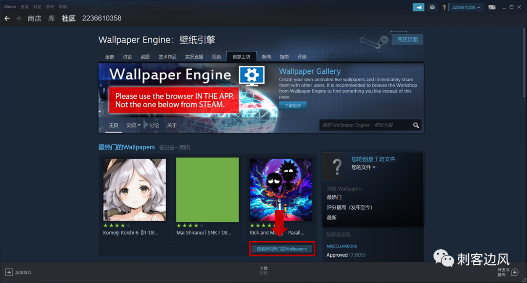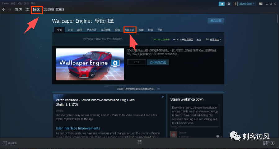 在加速器里启动Steam,并在社区中找到Wallpaper Engine,再点击创意工坊: