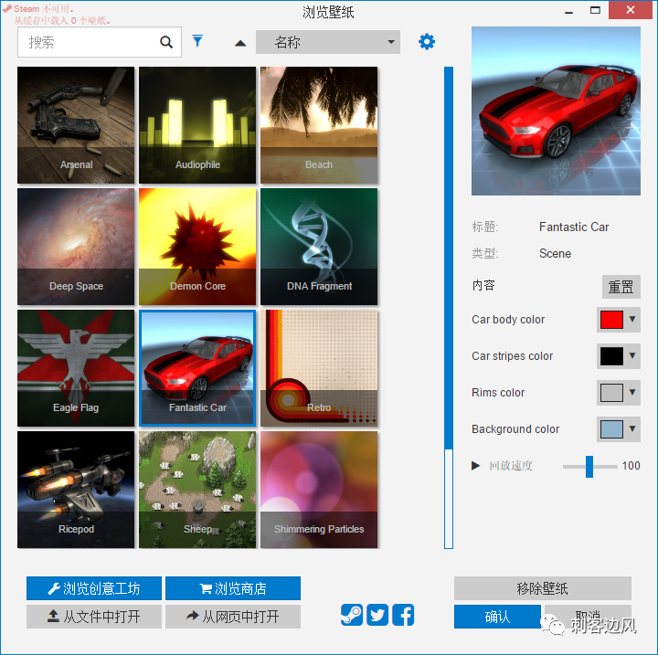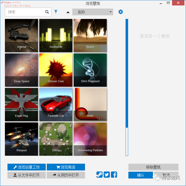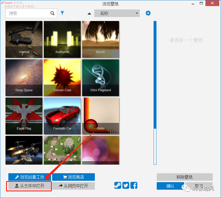 至于如何导入新的壁纸资源,刺客这里简单为大家做一下演示,简单来说,就是下载壁纸资源后,利用软件左下角的“从文件打开”按钮中直接选择壁纸文件即可:
