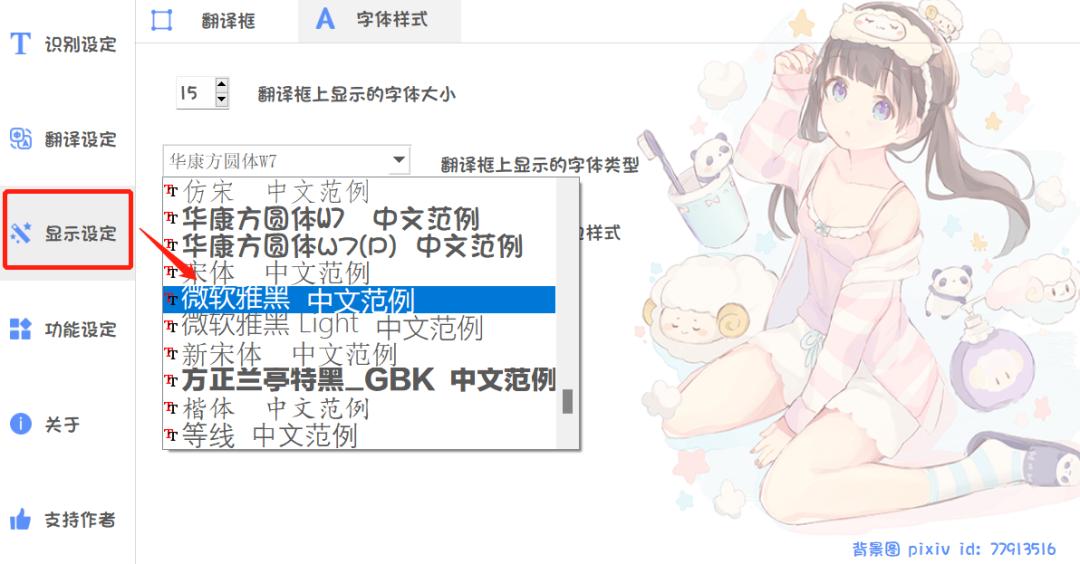 这里面分别有识别设定、翻译设定、显示设定、功能设定等内容。