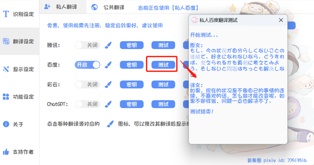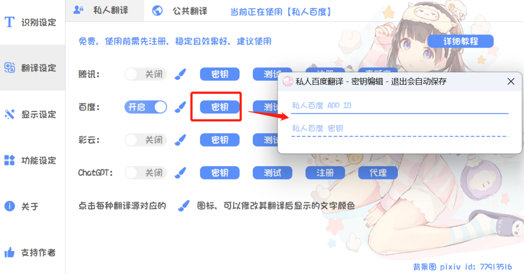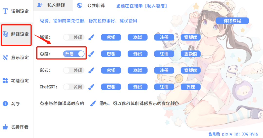 操作完上面这步后,我们点击左边的翻译设定,在里面找到私人翻译,并开启百度: