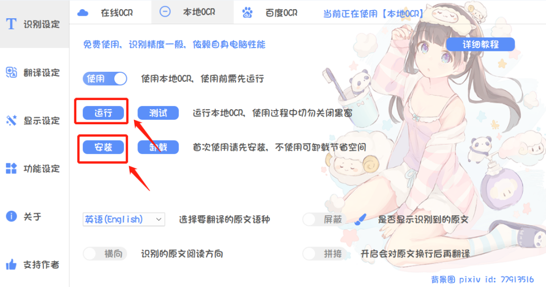 但是在线OCR和百度OCR都是收费的,刺客并不推荐,所以,我们只能选择本地OCR。具体操作,先点击安装,之后再点击运行: