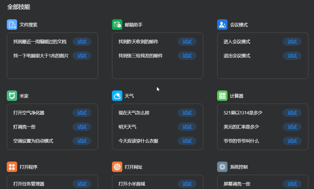 唤醒方式,可通过点击语音按钮或输入文字使用,语音唤醒功能也有,不过目前仅支持小米自家的笔记本电脑。