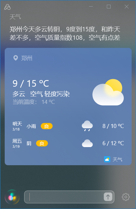 天气预报查询,这个以前刺客都是跑到客厅问天猫精灵的,这下好了,直接问电脑: