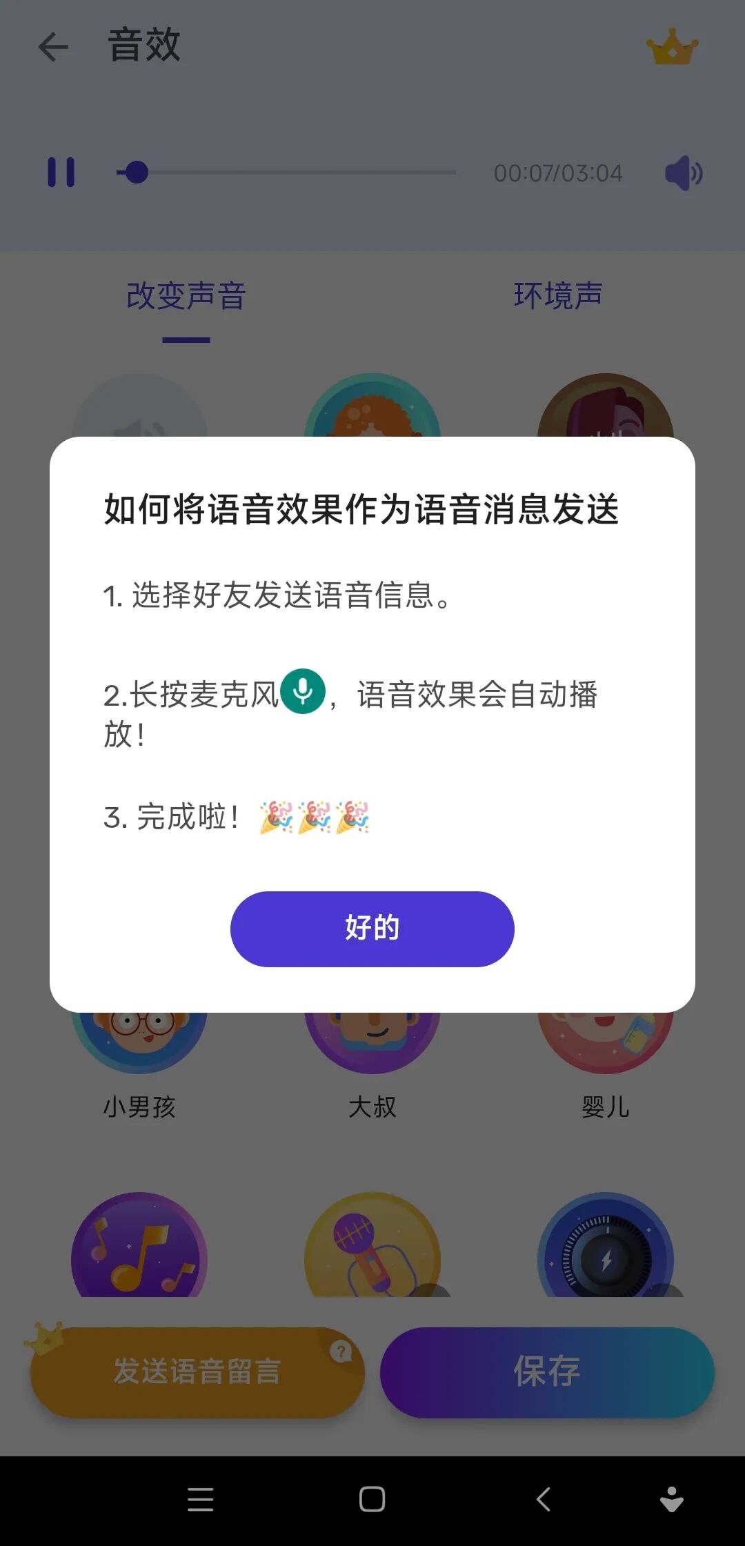 至于如何在游戏和社交软件里,发送实时变声,也很简单,只需要长按麦克风即可:
