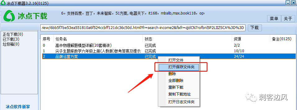 在左侧的已下载列表中查询,鼠标右键勾选打开保存文件夹: