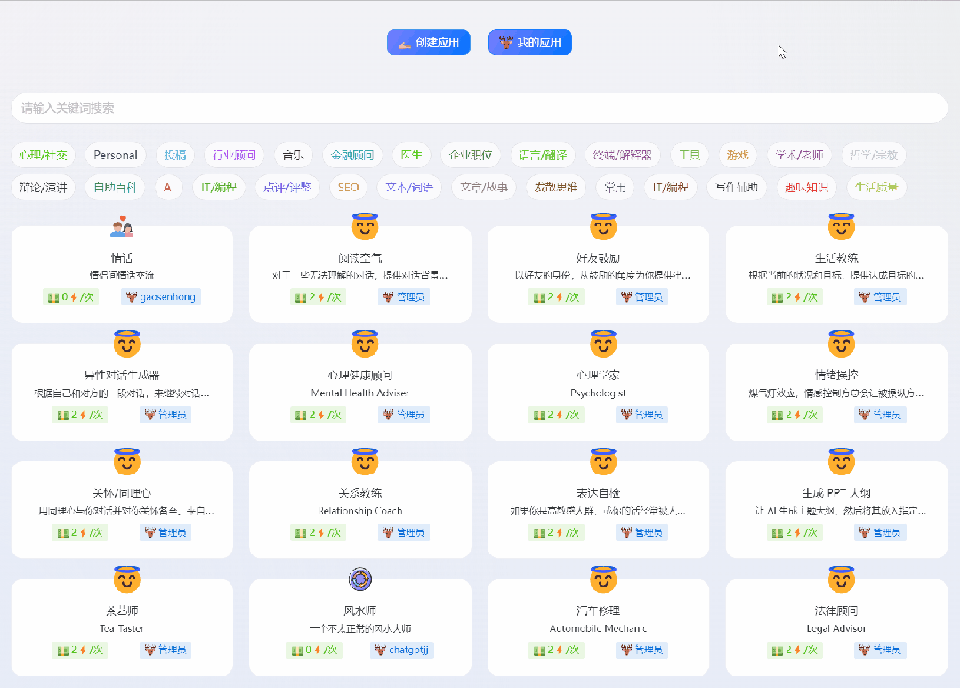 除了以上这些,网站还有一个非常硬核的功能,也就是这个轻应用模型,里面不仅提供了几百个模板,更支持自定义创建,可以生成属于自己的Ai人工智能机器人,这种含金量,应该也都不需要刺客过多解释了....