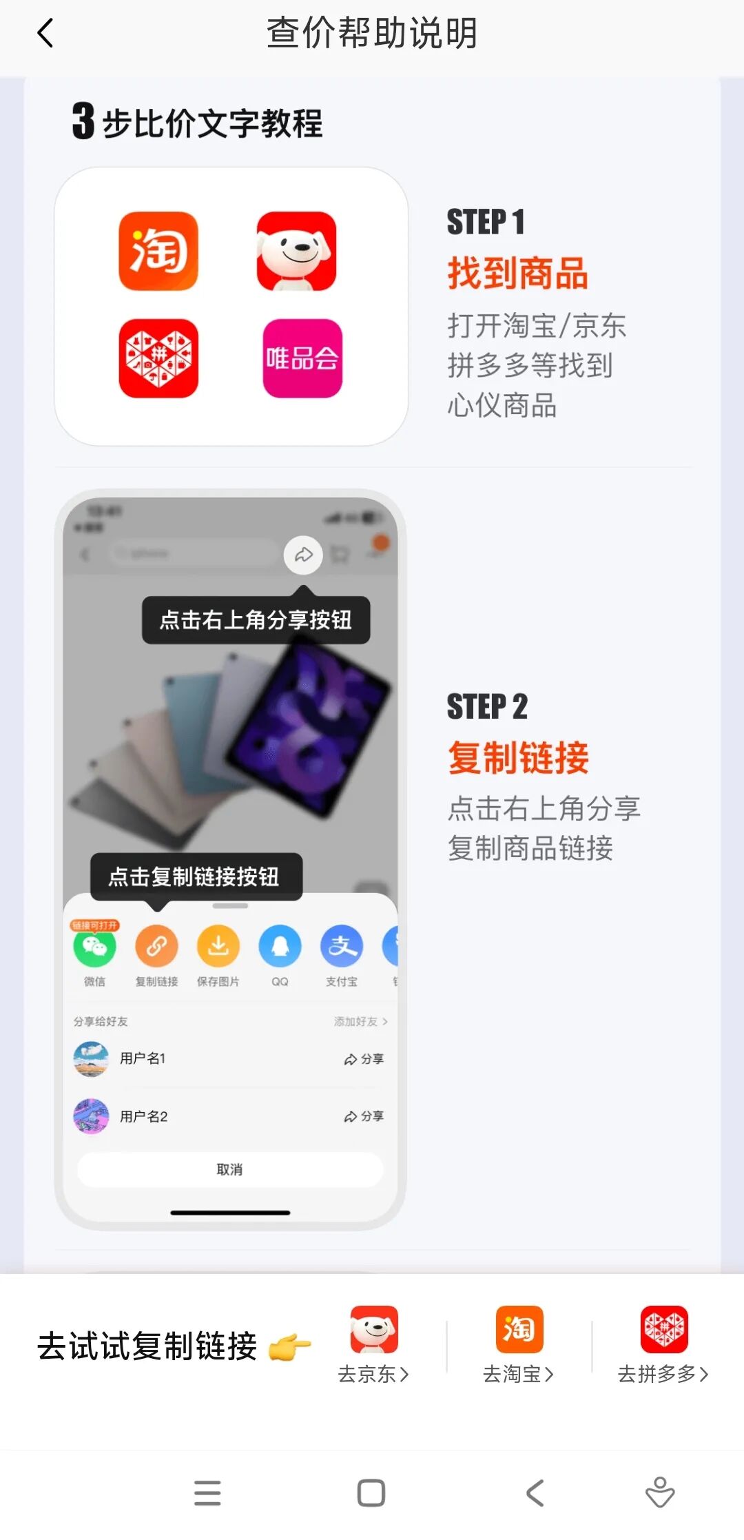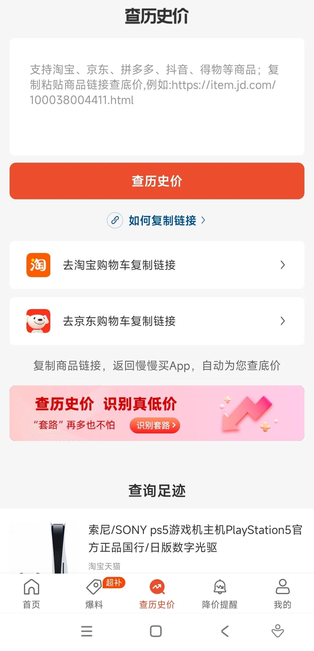 除了在这个APP内进行搜索外,我们也可以点击底部的查历史价,然后将外部的分享链接粘贴进来: